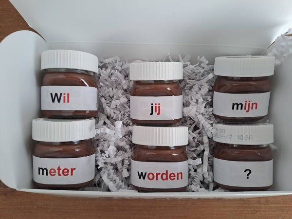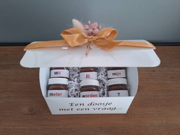 In het doosjes zitten 6 mini potjes Nutella met een leuke vraag!